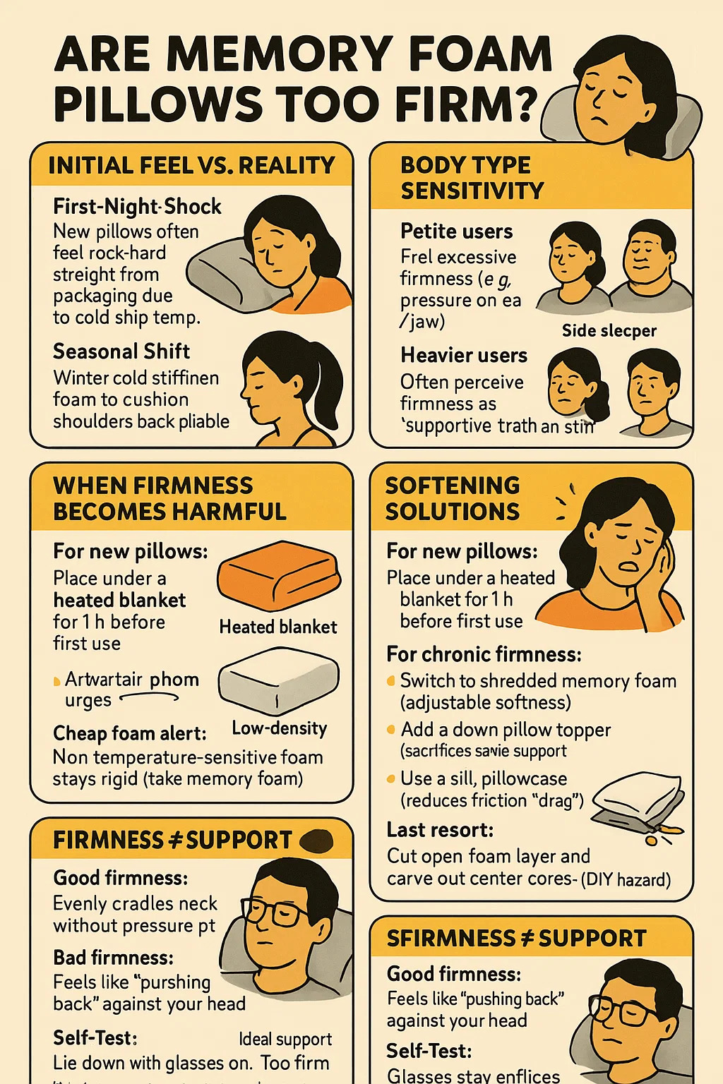 För kronisk fasthet: → Byt till strimlat minneskum (justerbar mjukhet). → Lägg till en nedkudde topper (offrar lite stöd). → Använd en sidenkudde (minskar friktionen "drag").