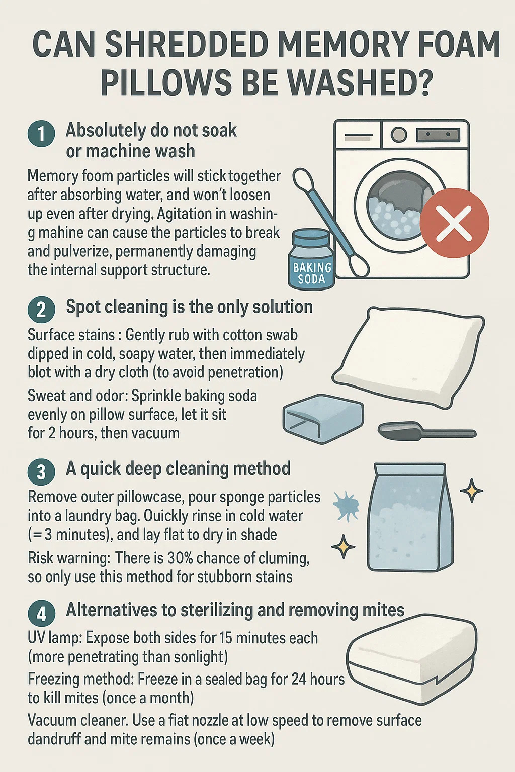 Ta bort den yttre örngottet och häll svamppartiklarna i en tvättväska. Skölj snabbt i kallt vatten (≤3 minuter) och lägg dig platt för att torka i skuggan (utsätt inte för direkt solljus eller torktumlare).