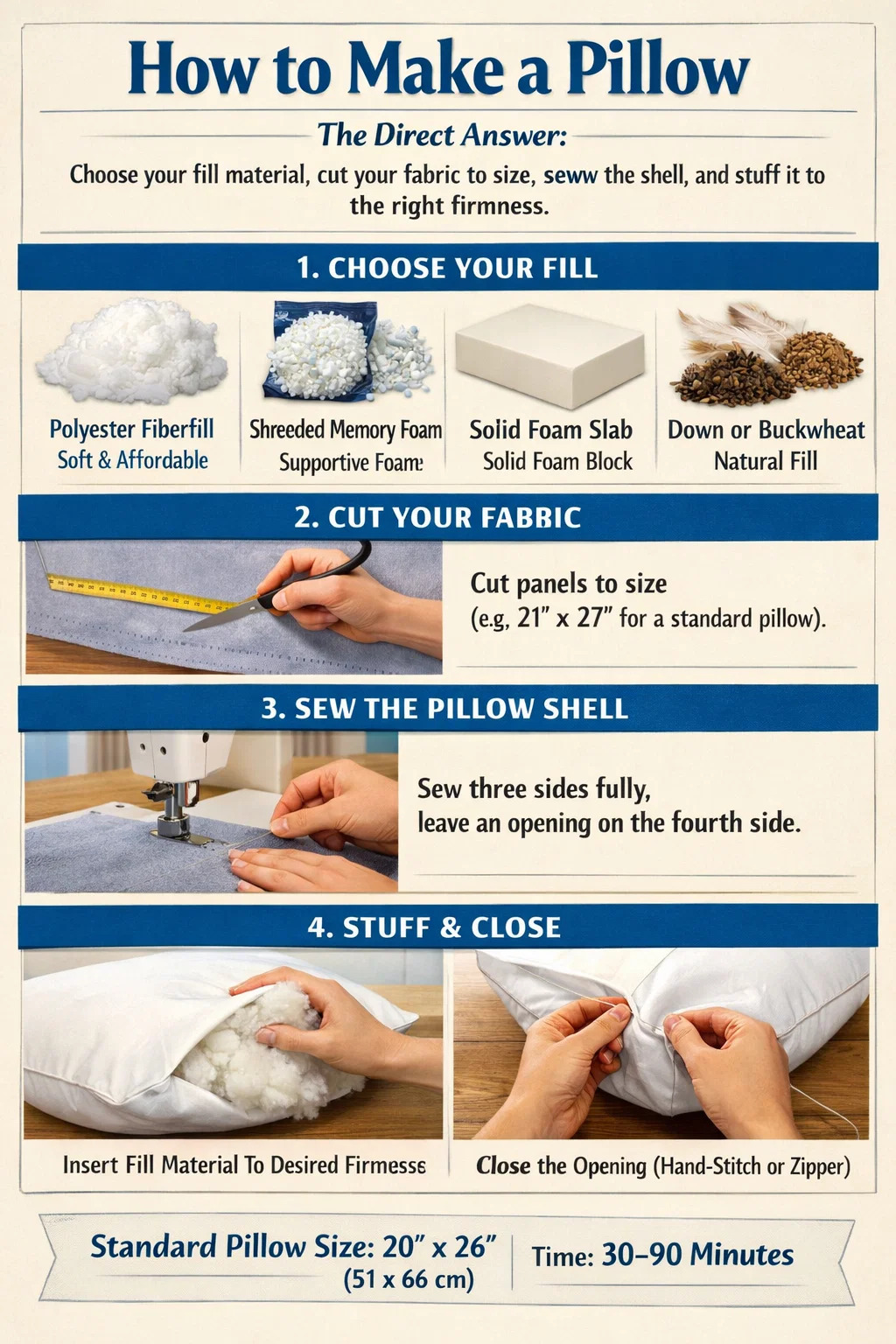Att göra en kudde handlar om fyra grundprinciper: välj ditt fyllningsmaterial, klipp till tyget, sy skalet och fyll det till rätt fasthet. För de flesta människor, en vanlig sängkudde mäter 20 × 26 tum (51 × 66 cm) , och hela processen – från att klippa tyget till att stänga den sista sömmen – tar mellan 30 och 90 minuter beroende på din fyllningstyp. Om du arbetar med en memory foam-kudde skiljer sig processen något eftersom du skär eller river skum istället för att fylla med lösa fibrer, men det strukturella tillvägagångssättet förblir detsamma.