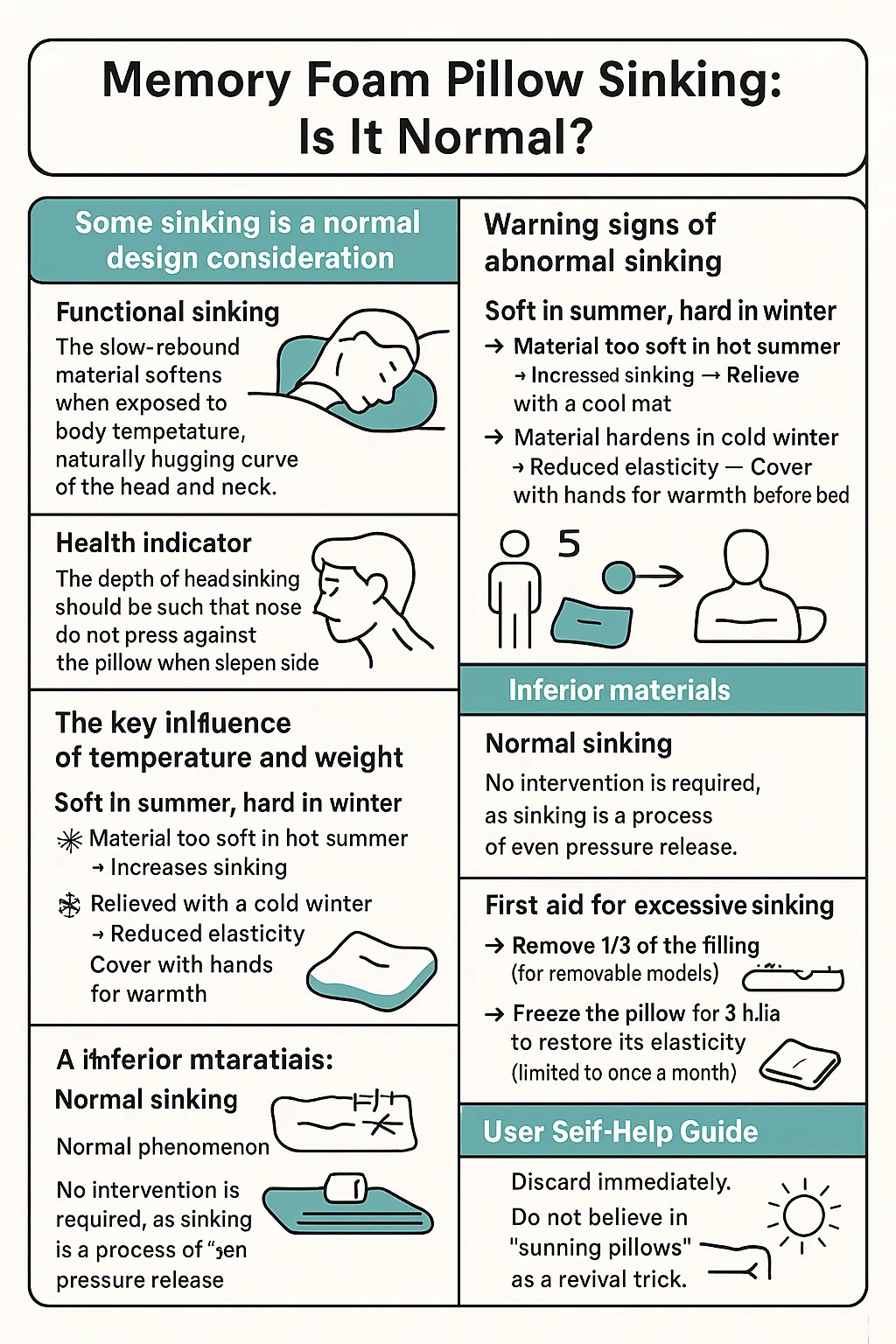 Första hjälpen för överdriven sjunkning: → Ta bort 1/3 av fyllningen (för avtagbara modeller) → Placera en vikta handduk under örngottet för tillfälligt stöd → Frys kudden i tre timmar för att återställa dess elasticitet (begränsad till en gång i månaden).