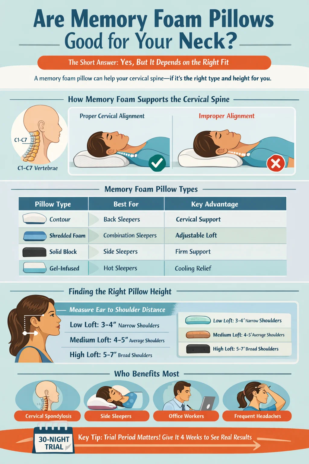 En kudde med memory foam kan vara genuint fördelaktig för halsryggraden - men bara när den matchar din sovställning, kroppsstorlek och specifika nacktillstånd. Det här är inte en lösning som passar alla. Materialet i sig är inte magi; Det som får memory foam att fungera är dess förmåga att anpassa sig till din nackes naturliga kurva och omfördela trycket bort från känsliga kotleder. Studier har visat att felaktig kuddhöjd är en av de främsta orsakerna till kronisk nacksmärta, och memory foams adaptiva struktur hjälper till att ta itu med detta genom att eliminera luckorna mellan din nacke och sovytan som traditionella kuddar ofta lämnar.