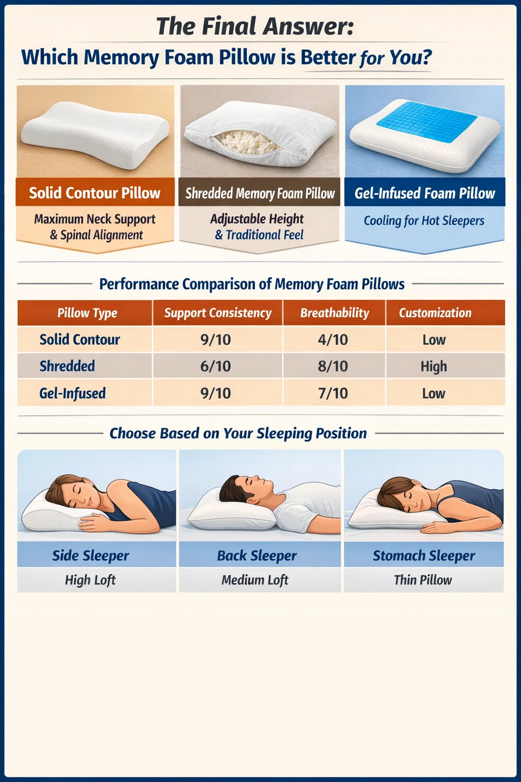 Det finns ingen enskild "bästa" kudde, men det finns en klar vinnare utifrån dina specifika sovvanor. Om du prioriterar maximalt nackstöd och ryggradsuppriktning, a solid contour kudde med memory foam är överlägsen. Om du föredrar en traditionell känsla med möjlighet att justera höjden, en strimlad kudde av memoryskum är det bättre valet. För dem som ofta vaknar och svettas, a gelé-infunderad eller öppna-cell memory foam kudde är det enda möjliga alternativet för att förhindra överhettning.